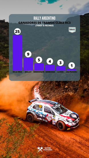 RC3: Con un total de 25 tramos en su cuenta personal, Nicolás De la Vega es uno de los pilotos más efectivos de la categoría. El riojano no solo comanda este ítem, sino que también lo hace en el campeonato al mando del VW Gol Junior que atiende el Boaglio Competición. Tras el estreno del nuevo Toyota Etios, el entrerriano Victorio Ballay dio un salto para acercarse en el torneo y comenzar a sumar en este apartado en el que ya acumula 9 éxitos parciales. Martín Maisonnave (5), Darío Sambueza (4), Mario Llinás (3) y Germán Galfrascoli (1) son los otros nombres que aparecen en el listado.